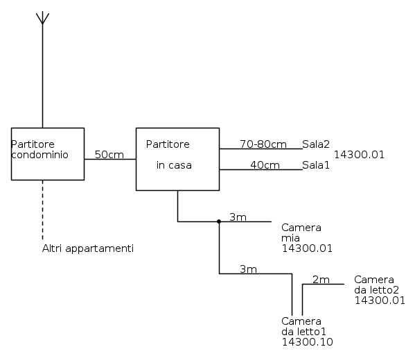 Il problema è che non so dove sia questa fantomatica giunta. Io ipotizzo che ci sia, perché dal partitore escono 3 cavi: due restano in sala e l'altro va alle camere. Questo per forza deve dividersi da qualche parte per dare segnale a camera mia e camera da letto. Staccando il cavo dal partitore infatti camera mia e camera da letto restano senza segnale.