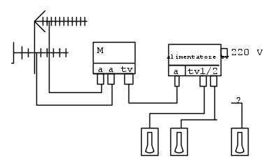 buon giorno questo è lo schema del il mio impianto antenna tv il problema è come faccio a collegare la terza tv non riesco a capire se devo mettere un derivatore o un partitore