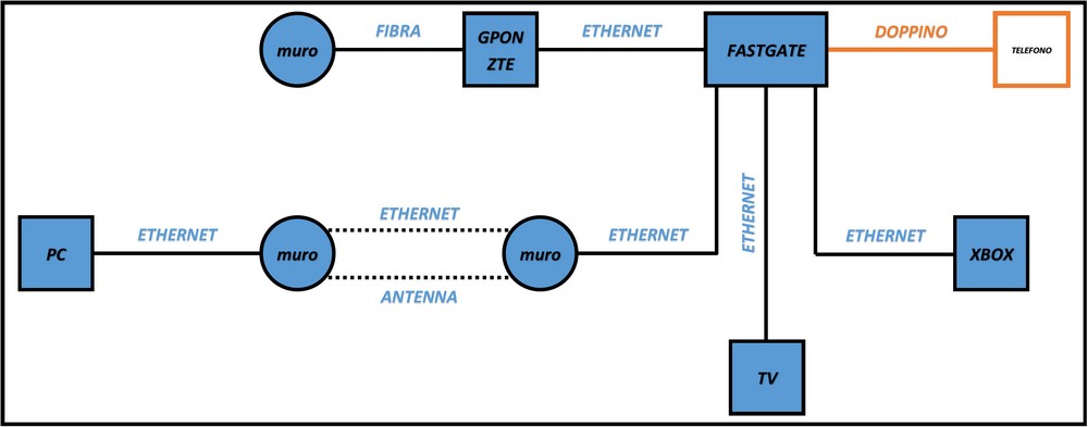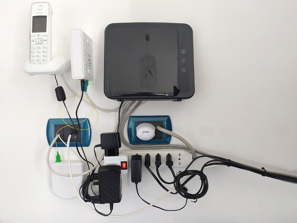 Come potete vedere, il modem è installato nel soggiorno e il mio PC si trova in un’altra stanza. Attualmente i due dispositivi sono collegati tramite una 15ina di metri di cavo ethernet cat. 5e FTP 24AWG da 6mm che scorre in un tubo corrugato nel muro insieme al cavo dell’antenna.