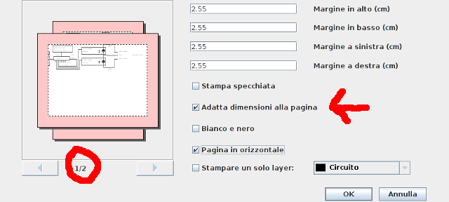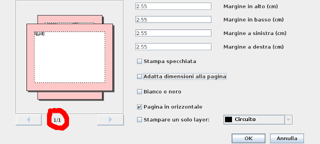 2) Selezionando l'opzione "Pagina orizzontale" e l'opzione "Adatta dimensioni alla pagina", compaiono 2 pagine da stampare (la seconda è vuota), mentre disattivando l'opzione "Adatta dimensioni alla pagina" c'è un'unica pagina da stampare.