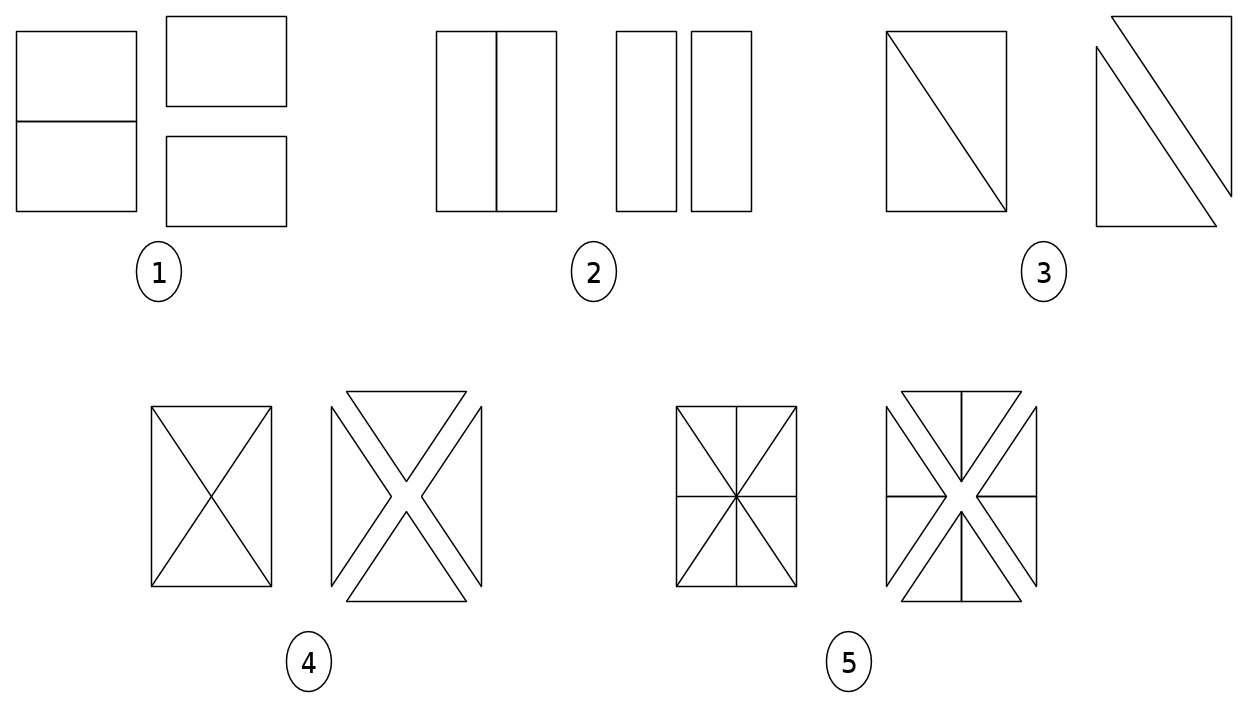 La fig. 4 mette in evidenza un enorme salto di qualità che gli egizi ad un certo punto devono aver fatto: le figure che si ottengono da un rettangolo diviso secondo le diagonali hanno la stessa superficie ovviamente. Ma è davvero così ovvio? direi di no: la forma dei triangoli è diversa e confrontarli non aiuta affatto.
