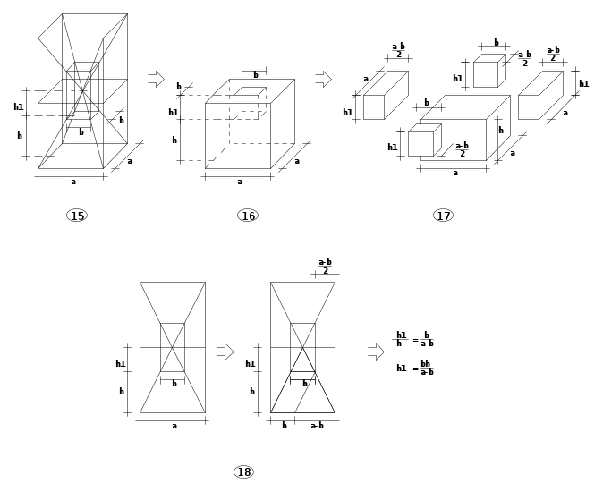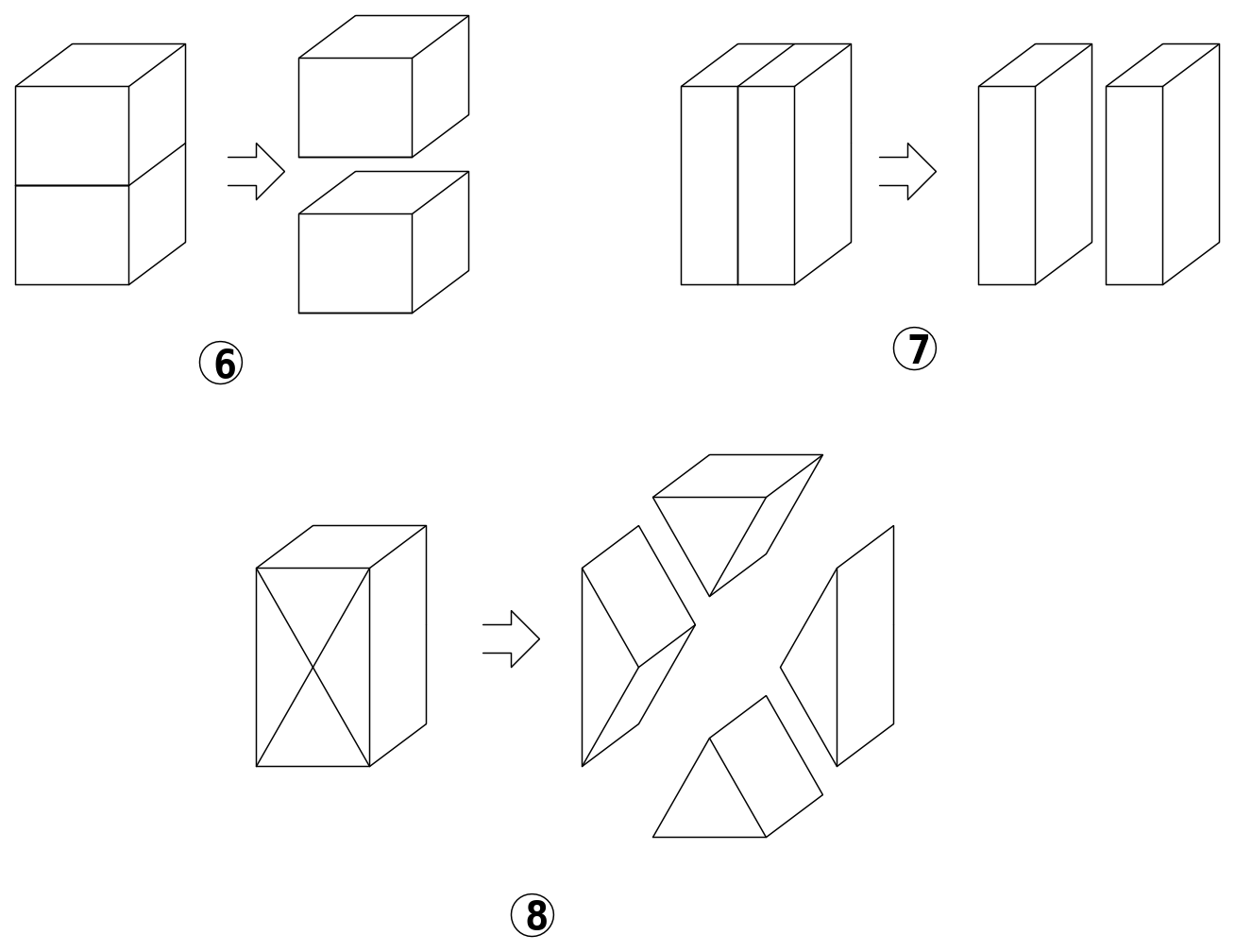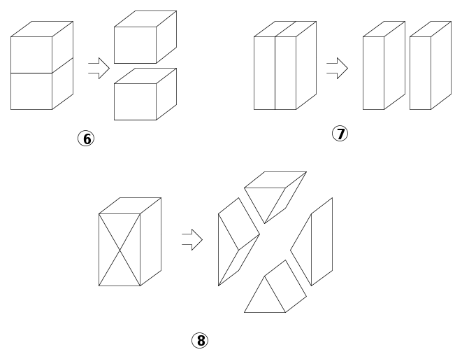 A questo punto l’estensione di questi concetti ai solidi deve essere stata immediato e dopo aver imparato a calcolare il volume dei parallelepipedi devono anche aver imparato a dividerli in parti uguali, fig.6 e 7 ed in particolare, fig.8,dove i quattro solidi che si ottengono, pur apparendo di forma diversa, hanno lo stesso volume.