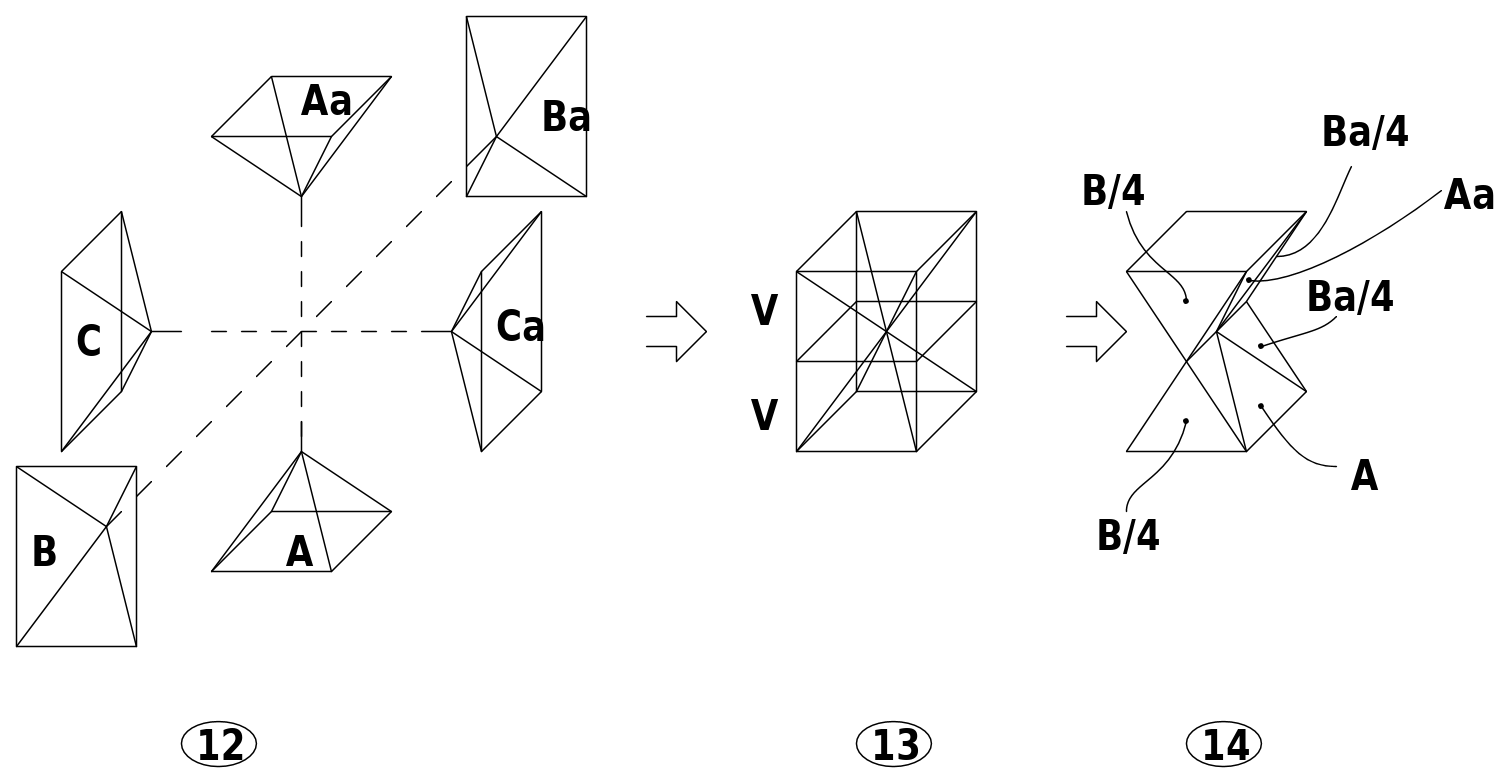 So anche che tagliando il parallelepipedo con due piani passanti per le diagonali di una faccia e ortogonali alla stessa faccia ottengo quattro solidi di uguale volume, due dei quali sono rappresentati in figura 14.