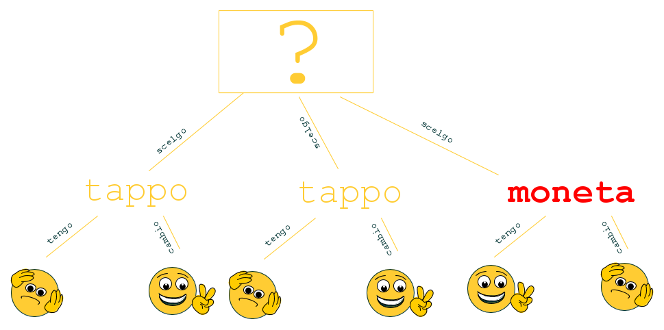Come vedete cambiando sistematicamente scelta vinco in due casi su tre, mentre non cambiando vinco solamente in un caso su tre