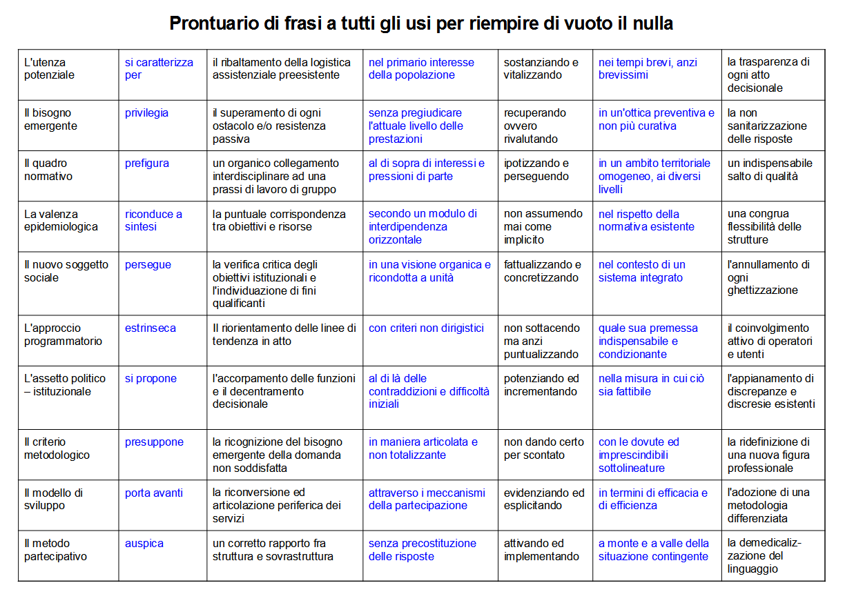 Rovistando tra le scartoffie di 30 anni fa, ho ritrovato una tabella per la composizione di frasi, dal titolo "Il generatore automatico dei piani sanitari", sottotitolo "Prontuario di frasi a tutti gli usi per riempire di vuoto il nulla". L'utilizzo è molto semplice: si sceglie una qualsiasi frase della prima colonna, si aggiunge una qualsiasi frase della seconda colonna, poi della terza, e così via fino all'ultima colonna. Alla fine si ottiene un periodo che, dal punto di vista grammaticale e sintattico, risulta corretto ma... del tutto privo di significato.