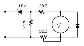 Il diodo in parallelo allo strumentino e' solo per salvarlo nel caso invertissi la polarita', usando uno di quegli strumentini recuperati dai BT168, che hanno 2mA di fondoscala, dovresti avere una misura fra 10 e 15V, con 10V ad inizio scala (leggermente non lineare all'inizio per la curva dello zener) e 15V di fondoscala, e l'assorbimento dovrebbe essere intorno ai due o tre milliampere sui 12-13V .