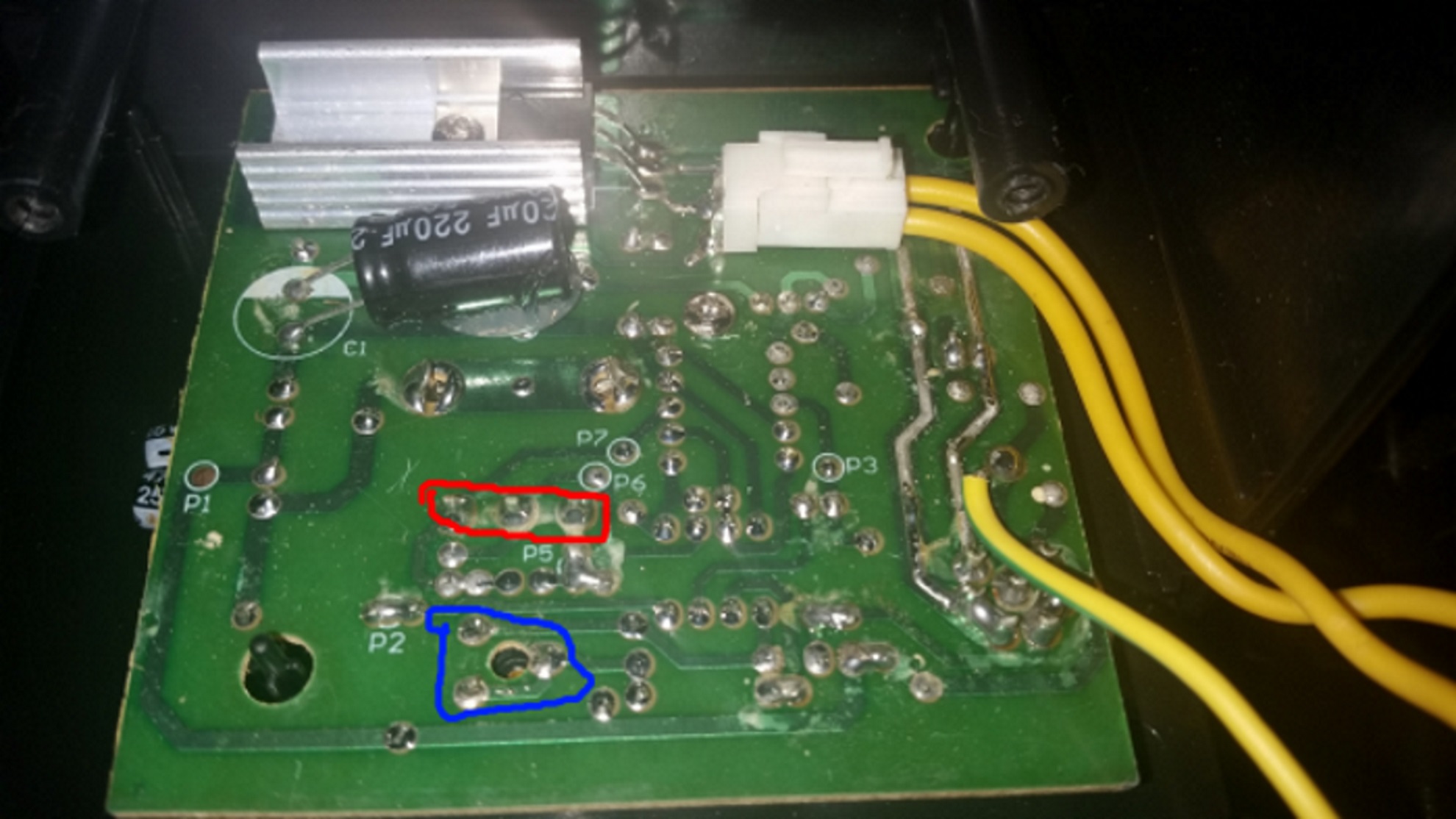 Ho appena aperto il saldatore, vi allego l'immagine della schedina e da come potete vedere ho individuato i due potenziometri, in rosso quello di selezione della temperatura e l'altro in blu di adjust chiamiamolo cosi. Purtroppo non riesco a vedere altro perché non posso smontare la manopolina avanti, non ho le esagonali piccoline per svitare le viti che sono ancorate all'asse del potenziometro. Dovrei portare il centrale a gnd per escludere il potenziometro ? cortocircuitando cosa dovrei notare? e se non fossero i potenziometri il problema ?