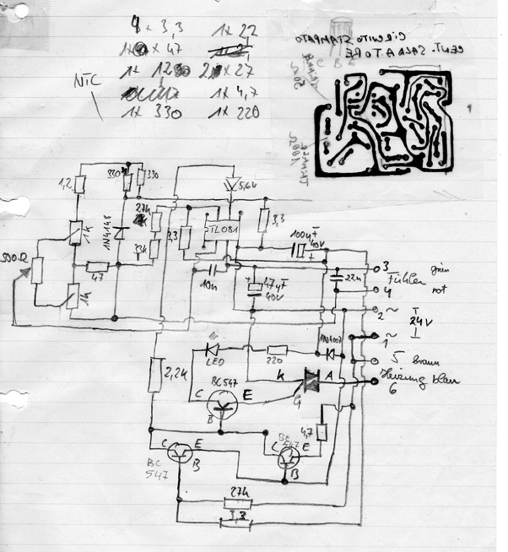 Scusate ma e una centralina che funziona da circa 30 anni e non ho uno schema fatto per bene ve lo posto ugualmente ma fa schifo, era quello originale della jbc ma modificato perché l'operazionale originale non era molto comune. 3/4 sensore 5/6 resistenza riscaldante