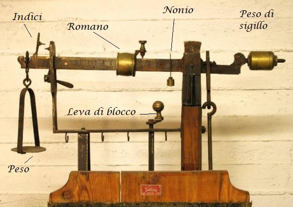 Si blocca la leva per permettere il carico dei sacchi di cereali, anche con poca delicatezza perché il piano è bloccato. Si aggiungq sul piattino un peso, ad esperienza del venditore, si sblocca la leva, (se si supera la scala occorre cambiare il peso) si muove il romano in avanti o indietro fino a che gli indici sono (quasi) sullo stesso piano, si fa lo stesso con il nonio.