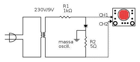 E' un circuito molto semplice con un generatore di funzione, una resistenza R1 che limita la corrente, il diodo e una resistenza "amperometrica" R2 ai cui capi prelevare una cdt proporzionale alla corrente. I conduttori tratteggiati sono i segnali utilizzati per tracciare la caratteristica all'oscilloscopio (CH1 è la x e CH2 la y).