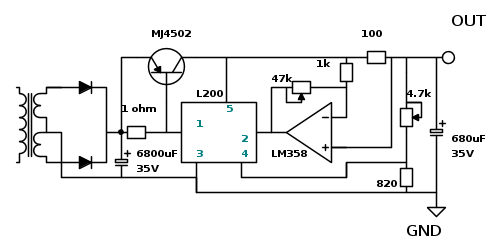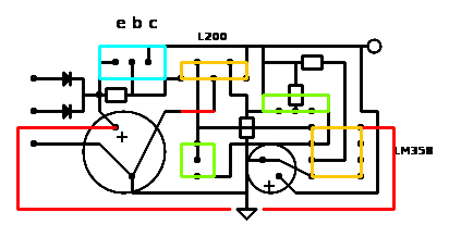 In azzurro ho segnato i terminali cui andra' collegato il BJT; con il verde quelli dei due potenziometri e con il giallo sia i pin del L200 che quelli del LM358.