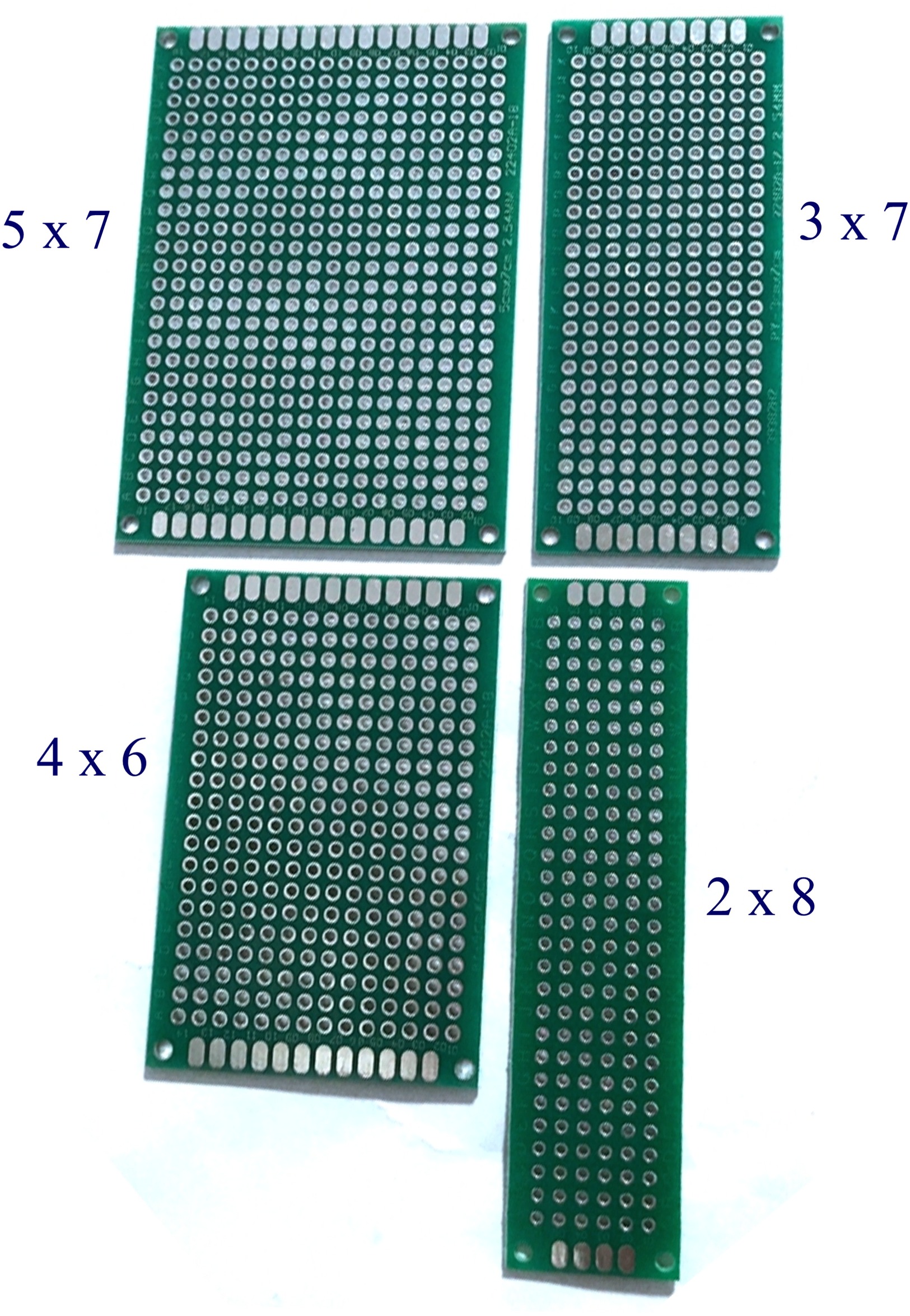 ampia? Ma quanto? Era illusorio sperare in una dimensione da chip da 14 pin ma anche troppo grande è un problema. Per alzare la nuova basetta potrei inserire un certo numero di zoccoli uno dentro l’altro, ne ho diversi, ma ci sono anche i trimmer, i condensatori, le resistenze di limitazione corrente che non sono piccoli e superarli non è come dirlo. Allego l’immagine delle basette che ho a disposizione: