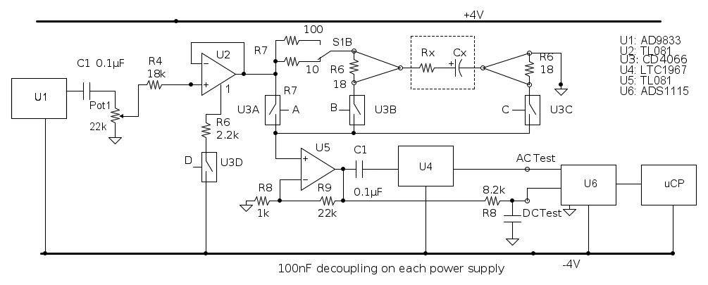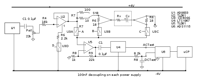 Col contatto collegato al pin 1 del primo operazionale (U2) si comanda in uscita una piccola tensione continua (circa 35 mV) per verificare le caratteristiche in dc del condensatore.