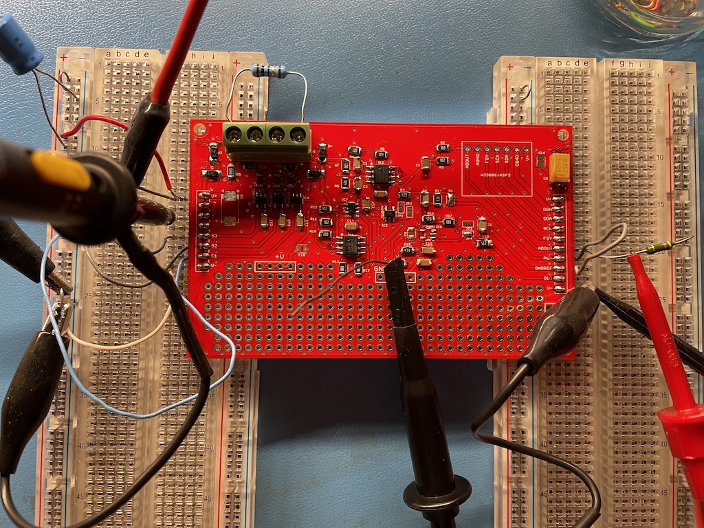 Allora, ho montato il circuito. Non proprio tutto, perché mi sono accorto di aver ordinato il MCP6001U che ha una piedinatura diversa dall'MCP6001, quindi l'ultimo blocco del circuito non può funzionare