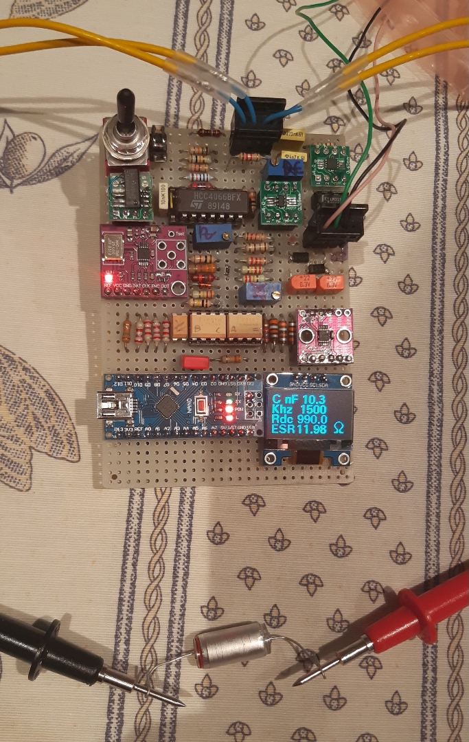 Io ho avuto finalmente un po' di tempo libero per riprendere la mia versione e con un po' di modifiche al firmware sembra che si riesca a misurare dei condensatori anche di taglia un po' più interessante. Non credo che il circuito in questa situazione sia molto preciso, ma è comunque utile perché la misura si può fare in-circuit. Adesso la frequenza minima utilizzata è 50 Hz, forse si può scendere a 20 Hz, il che permetterebbe di fare misure migliori su queste capacità. Ho provato con 10 Hz e ci sono dei problemi perché le costanti di tempo usate dal circuito lock-in sono troppo piccole.