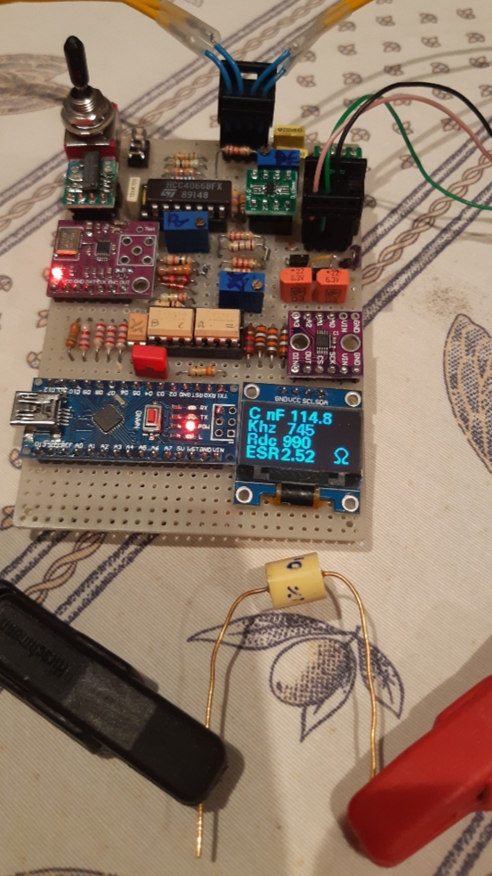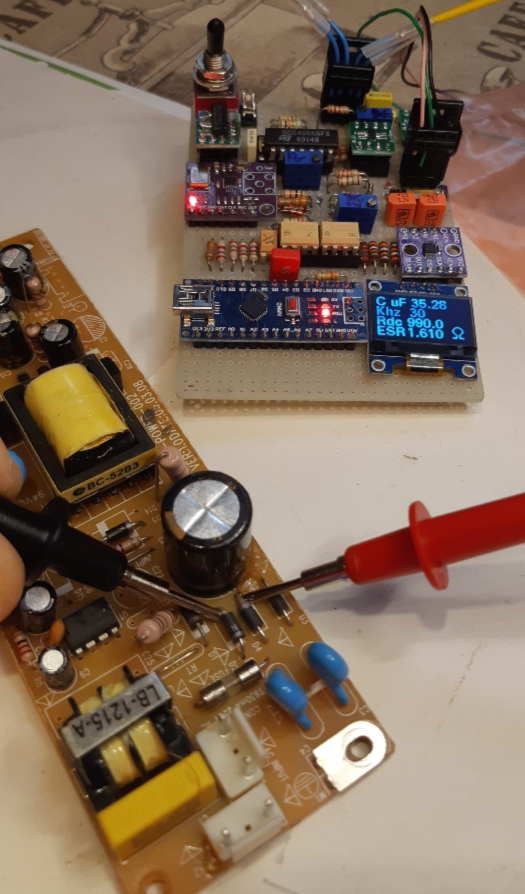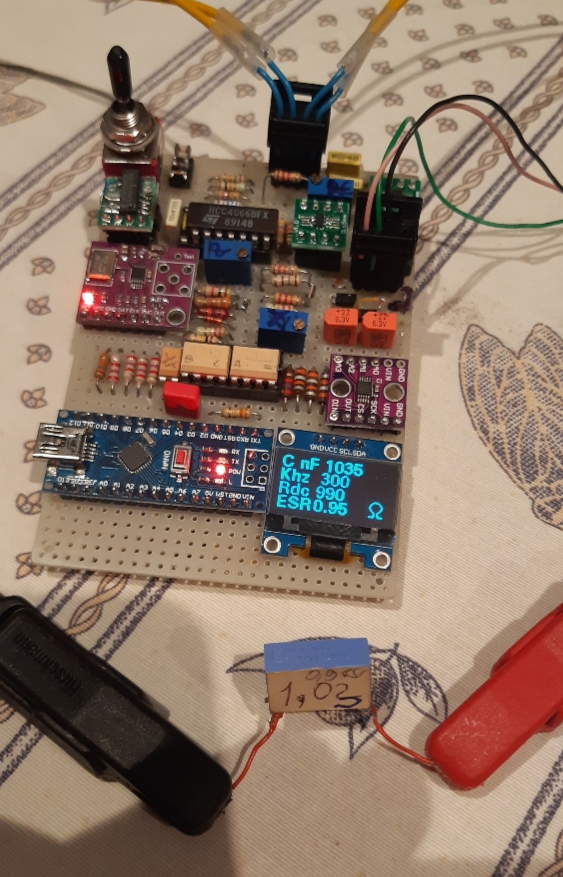 Mi sembra che ci stiamo avvicinando ad una versione utilizzabile del circuito. La misura dovrebbe essere possibile in-circuit (ho provato con qualche vecchio alimentatore da PC con elettrolitici scoppiati e si vede bene dove ci sono dei problemi). Speravo però di riuscire ad avere misure più precise, ma ci sono effetti abbastanza delicati da prendere in conto. Farebbe molto molto comodo avere delle misure in quadratura fatte con il lock-in, ma non val la pena in un circuito così piccolo che ha vocazione di essere utilizzato sostanzialmente come mezzo diagnostico.