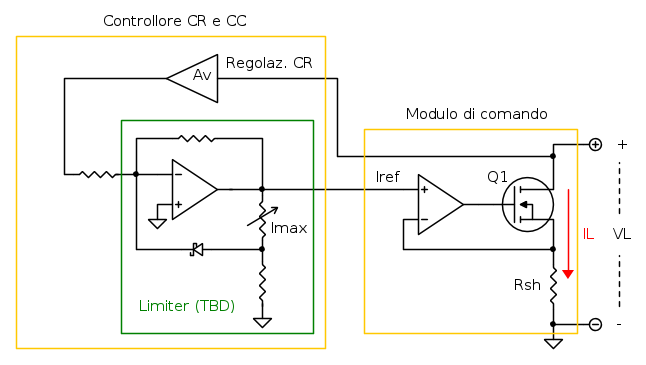 Il guadagno Av dello stadio di prelievo consente di regolare il valore di resistenza equivalente in modalità CR, mentre la soglia del limiter corrisponde ovviamente al limite di corrente.