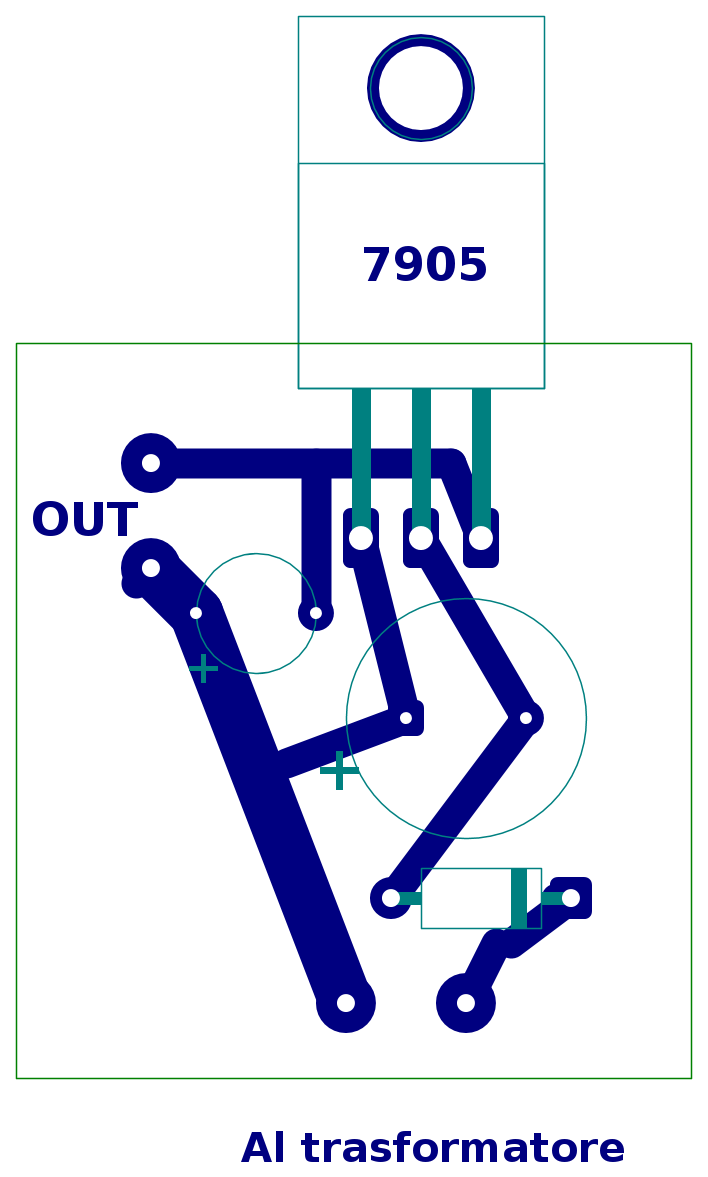 Di seguito metto lo schema del PCB relativo all'alimentazione negativa; aspetta che lo riguardi qualcuno, perche' l'ho fatto in due minuti.