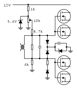 Un trimmer che preleva una tensione stabilizzata da uno Zener e la applica ai Gate tramite una resistenza di 4,7 K.