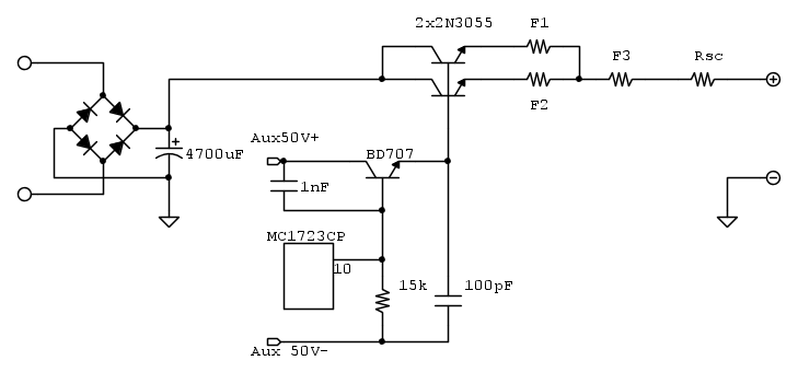 L'integrato principale è un classico MC1723CP, che comanda una serie di transistor come nello schema.