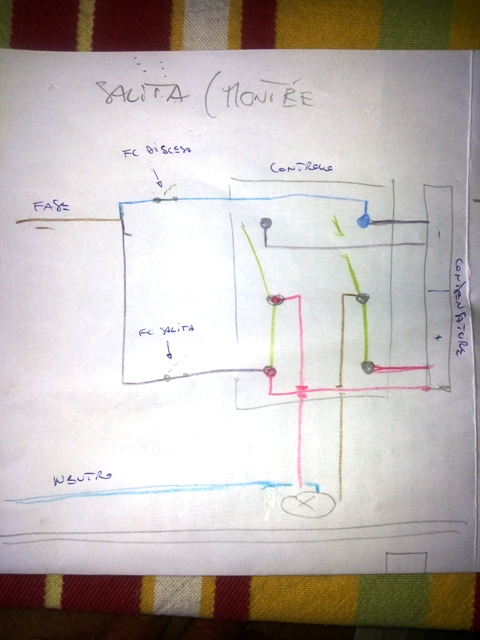 Il controllo è a sei poli e funziona a bilancia, in modo che premendolo connette i due rossi (o i due neri) al rotore. I fili sono connessi al controllo sono incrociati, in modo che se per es. per la salita il rosso con la fase finisce (sul rotore) a destra del neutro, per la discesa il nero con la fase finisce a sinistra. In altre parole, se chiamiamo da sx a dx i due contatti in alto 1 e 2, quelli al centro 3 e 4, quelli in basso 5 e 6, dal condensatore il nero in 1, il nero con la fase in 2, rosso con la fase in 5, rosso in 6, vanno al rotore il marrone in 3 e il rosso in 4; premendo in alto si chiudono i contatti 3-5 e 4-6 mentre premendo in basso si chiudono i contatti 1-3 e 2-4.