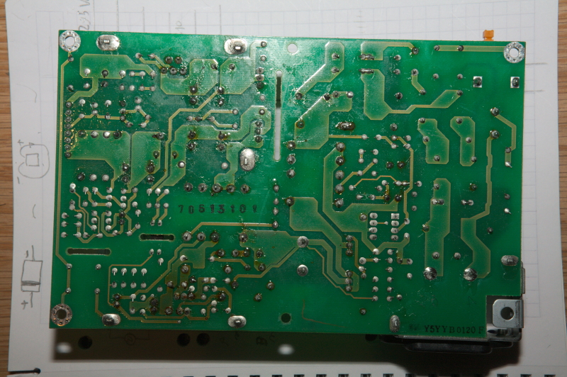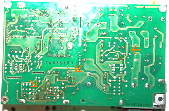 Dando comunque uno sguardo sommario alla scheda, dopo aver schiarito un po' la foto, pare che ci siano un paio di zone sospette in cui le saldature appaiono rifatte o comunque in cui si nota uno scurimento della vetronite.