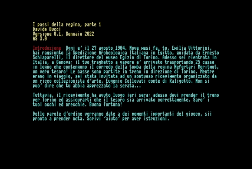 Se qualcuno qui ha seguito le mie peripezie con le avventure testuali, segnalo che ho appena finito di tradurre The Queen's Footsteps in italiano. Il gioco si chiama I passi della regina ed è ambientato tra Genova e Torino nel 1904.