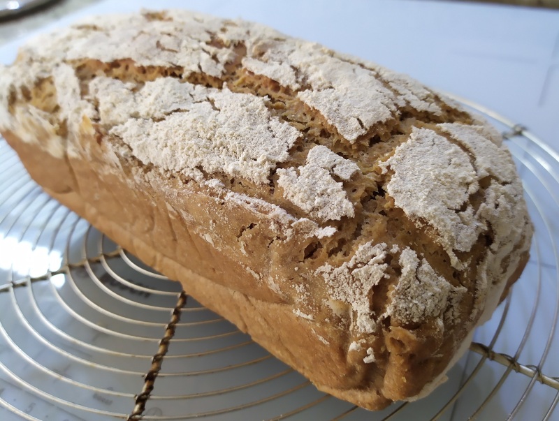 Nell'attesa di riparare la planetaria continuo ad impastare a mano (400 segale semi integrale, 100 grano duro, lievito naturale disidratato, olio evo, acqua), questa volta per la prima volta però ho provato a metterlo in cassetta, questo il risultato:
