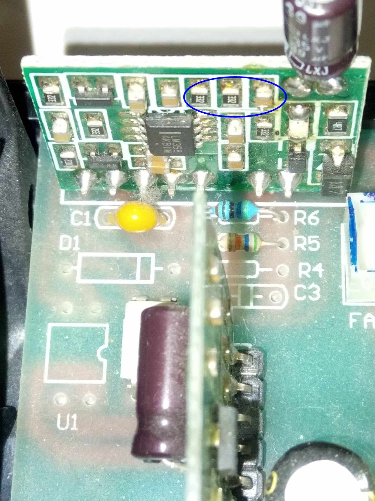 Si hai ragione, ho controllato meglio e a scaldare non è l'integrato ma uno o più componenti delimitati dal cerchio. Non è facile capie quele sia di preciso perché sono, ravvicinati e con il dito non riesco a discriminare la fonte di calore ma scalda di brutto. Tenere appoggiato il dito è impossibile.