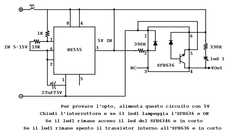 Mi sa che tutti gli SFH636 venduti in cina e anche sui portali Italiani sono FACHE originali. Intanto ho creato il circuito che lavora al contrario degli altri tester. Quando si inserisce l'optocoupler e si da tensione, il led deve accendersi, quando si preme il pulsante si da tensione anche al led interno dell'optocoupler, in questa posizione il led esterno si dovrà spegnere, questa situazione indica che l'optocoupler è buono.