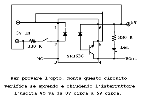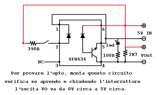 Non so come viene fatto lavorare sul circuito.[/quote] il tester funziona benissimo, e alimentato a 5V a me basta sapere che non è un falso, potrei abbassare la resistenza a 2k2, il led non va montato come lo hai messo tu perché dove hai messo l'anodo vi è l'output positivo e non negativo, appena si inserisce l' SFH636 e si da tensione, il led si accende quando si da tensione al pin1 e al pin2 dell' opto, e si deve spegnere se si preme il pulsante