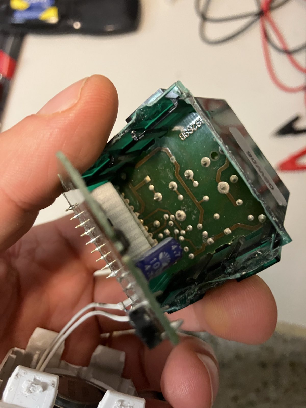 Il problema ora è estrarre le scheda interna (una, come da foto, è già fuori), sulla quale si trovano i condensatori. Questa sembra ben incastrata dentro e non arrivo a smuoverla. Mi viene persino il dubbio che il connettore (altra foto) sia in qualche modo incollato all'involucro verde.