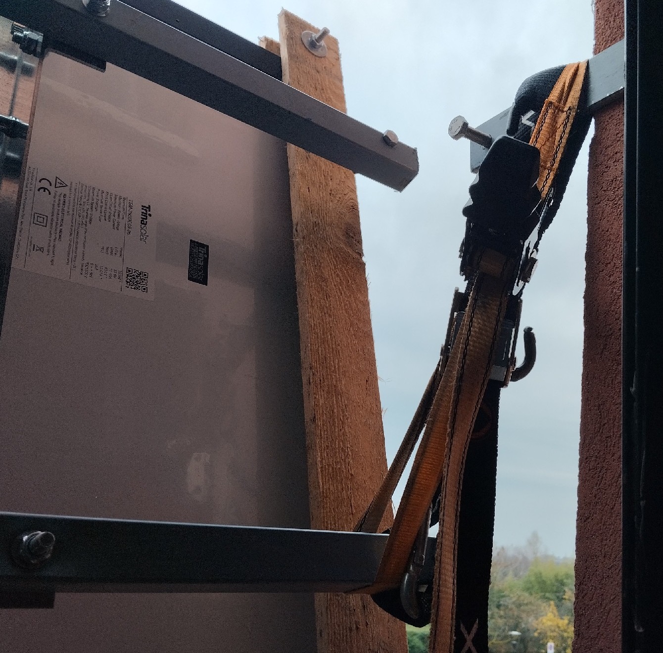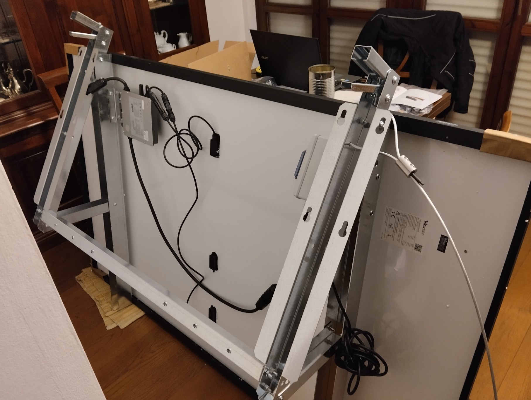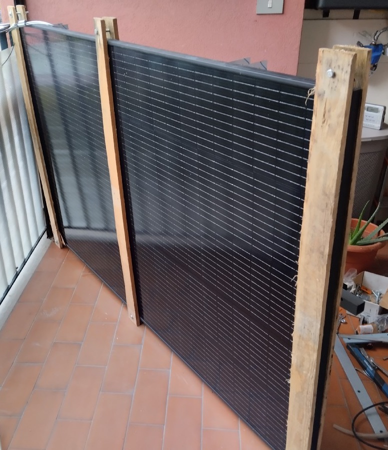 Ora il pannello è verticale, mancano due staffe che permetteranno (se non sbaglio i conti) di inclinarlo tra i 20 e i 40° rispetto al piano orizzontale
