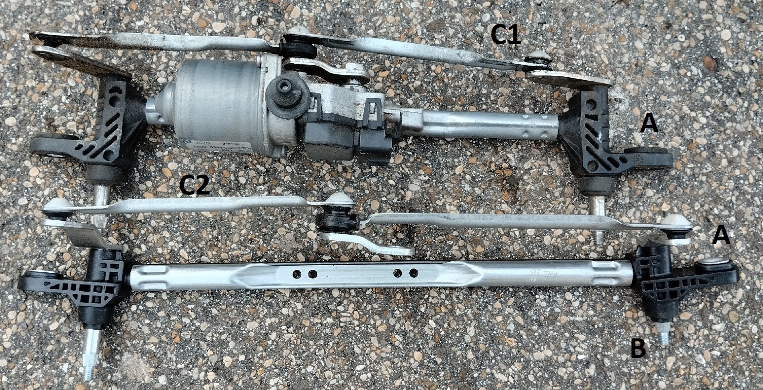 Durante il montaggio verifico che non sempre i ricambi economici sono un affare: il leveraggio ha un diverso interasse sia dei fissaggi A che dei tergicristalli B; inoltre i due fissaggi A non sono complanari a causa della poca rigidità del tutto.