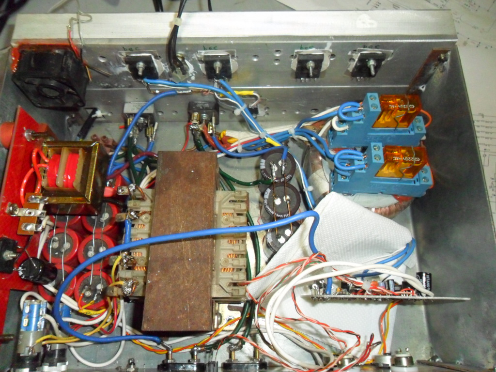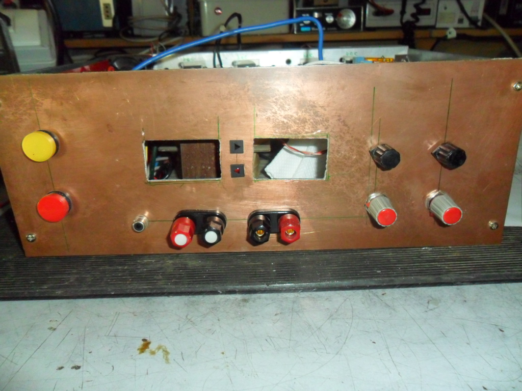 Guardando le foto si vede che sul frontale ci sono due finestre, ci vanno due display led con voltmetro ed amperometro da 3 cifre ognuno, perché come si vede dalla foto interna ci sono due grossi trasformatori, per avere due alimentatori di potenza distinti, uno sotto i 40 V ed uno sotto i 70 V, quest'ultimo ancora è da approntare.