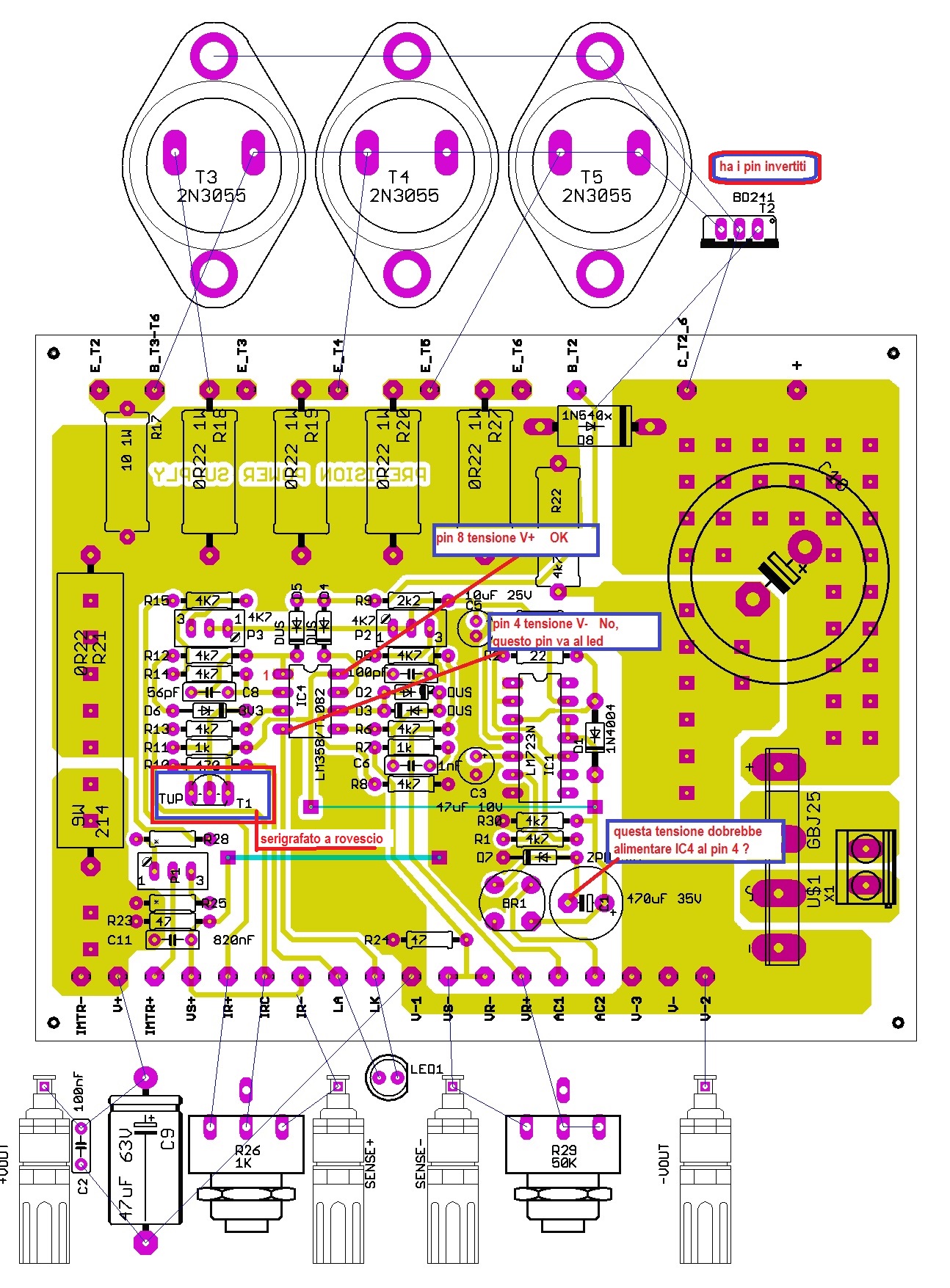 Metto un'immagine della PCB componenti, dove indico i punti che io ho trovato che non tornano con lo schema.