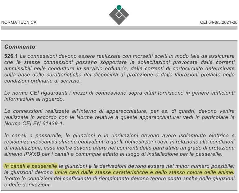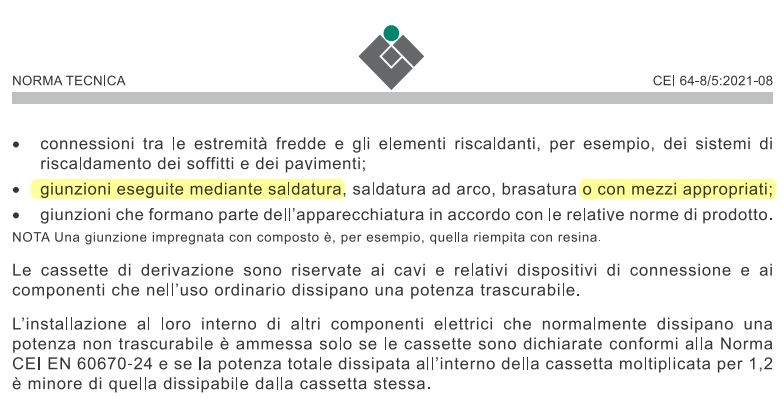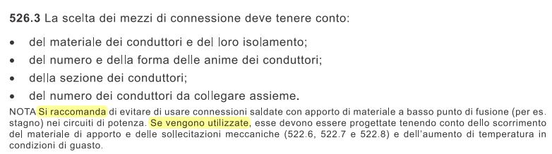 1) i conduttori devono essere preventivamente connessi meccanicamente (questo mi pare sia previsto anche nelle norme GOST russe), ciò che potrebbe discendere da un più largo uso di conduttori rigidi e semirigidi;