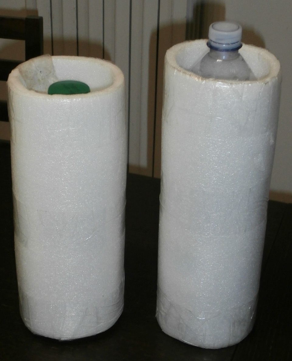 Quindi basta prendere un foglio di schiuma poliuretanica (ovviamente di recupero da qualche imballaggio), tagliarlo nella giusta misura e incollarlo per ricavare un tubo di diametro opportuno. Sul fondo un tappo dello stesso materiale.