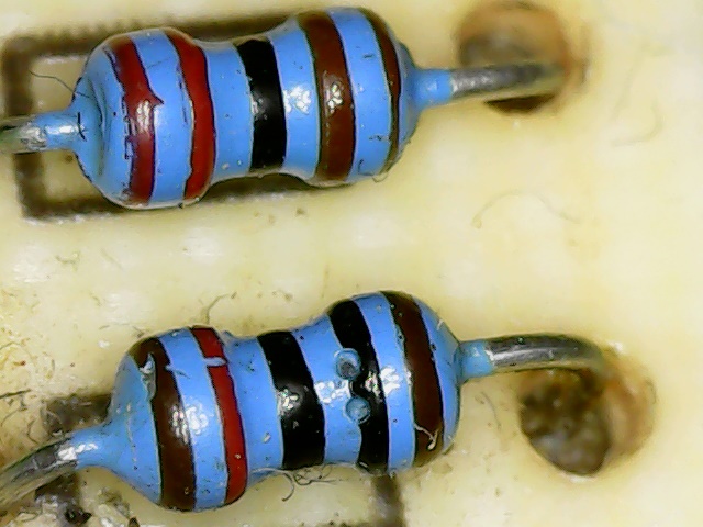 Ritengo più probabile la prima cioè un difetto sul "protective coating": per esperienza la cosa più semplice che puoi fare è dissaldare un reoforo dal circuito stampato e misurarla. Se il valore ohmico corrisponde al valore codificato dalle bande colorate allora è ok e puoi risaldarla sulla scheda :cool: