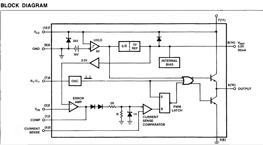 Ho trovato il seguente diagramma a blocchi del 3842, con qualche dettaglio in più, in cui il pin invertente del comparatore di soglia è collegato ad un generatore di tensione costante dove è chiaramente indicato 16V.