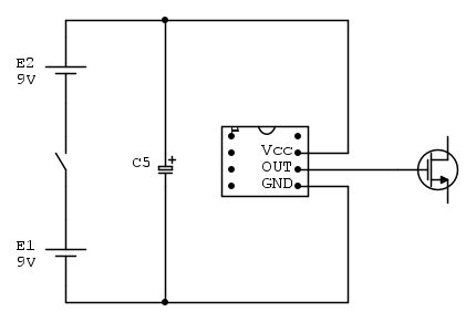 Due batterie da 9V in serie vanno benissimo. Il circuito per misurare se l'uscita che pilota il gate e` questo. I valori dei componenti non sono critici