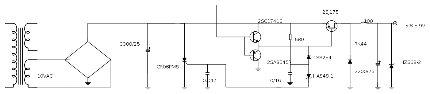 Salve ho un vcr hitachi VT-S895E da tempo non funzionante. Avevo deciso di riversare delle cassette su dvd ma mi sono accorto che alcune erano svhs e quindi dovevo far resuscitare il mio vecchio Hitachi. Premetto che non sono un riparatore ,a pensando che potesse trattarsi di un fusibile o qualcosa del genere l'ho aperto. Ho separato la parte alimentatrice ed ho trovato lo schema su internet. Purtroppo, a causa delle mie carenze in materia che però vorrei superare, non sono riuscito a capirci granchè. Il difetto consiste nel fatto che dando corrente salta il fusibile posto sul secondario del trasformatore. Ho provato a verificare l'integrità del ponte e del condensatore di livellamento (li ho staccati e collegati al trasformatore collegandoci un carico). Ho anche staccato i due diodi RK44 e HZS 68 e sostituito il mosfet 2SC175 ma senza risultati. Purtroppo non sono riuscito a reperire on line l'SCR CR06PM8. Sapreste indicarmi la strada (oltre a quella del centro assistenza ovviamente) per riuscire a recuperare il vcr? Per gli uomini di buona volontà ho a disposizione lo schema completo dell'alimentatore di cui ho allegato la parte che mi sembra non funzionare.