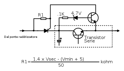 Ho solo la copia cartacea, era su un HD che è passato a miglior vita. E' un circuito dell'edizione estiva, quella con oltre 100 circuiti, edizione inglese. Non so di che anno sia, ad ogni modo è il circuito N.87, autore J.W. Gnodde, titolo "Heatsink shrinker". Il succo è nello schema Fidocad che ho postato. Quando la tensione ai capi del transistor serie è superiore a circa 5.5V il transistor in alto conduce e blocca l'SCR. Quando la tensione scende L'SCR conduce di nuovo e la tensione ai capi del condensatore sale. In questo modo la tensione media ai capi del transistor serie è limitata, con ovvi benefici sulla dissipazione totale