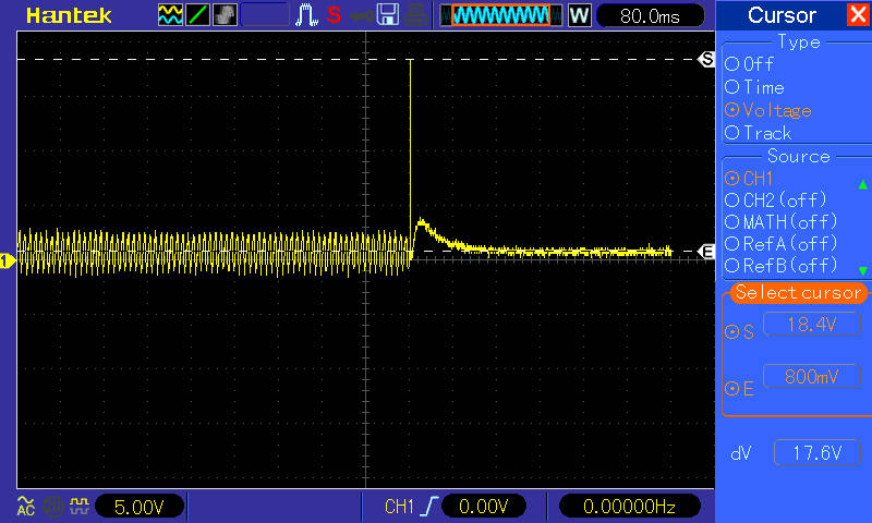 Dopo il montaggio della nuova scheda alimentatore , ho iniziato a fare i test per verificarne il rendimento il repple , la corrente massima ecc. Mi sono accorto che quando acceno o spengo con linterruttore , all'uscita della continua vi è un Madonno di picco sia in negativo(Quando accendo) sia in positivo (quando spengo) di circa 18V!!! Posto la figura dell'analisi del RIPLE con oscilloscopio e chiedo la cortesia di ricevere la soluzione a tale problema.