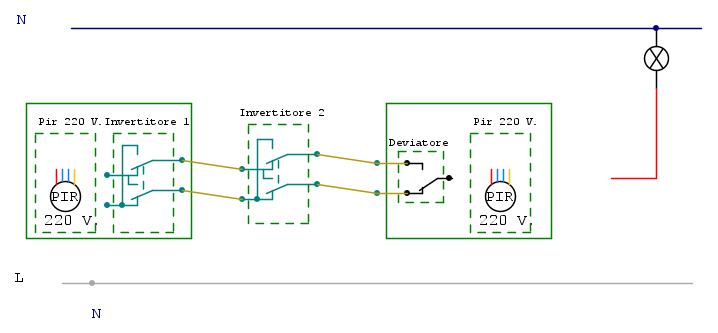ho provato fare un cablaggio con un solo PIR e funziona ma solo se gli interuttori sono in una certa posizione se cambio la posizione anche di uno poi non funziona più.