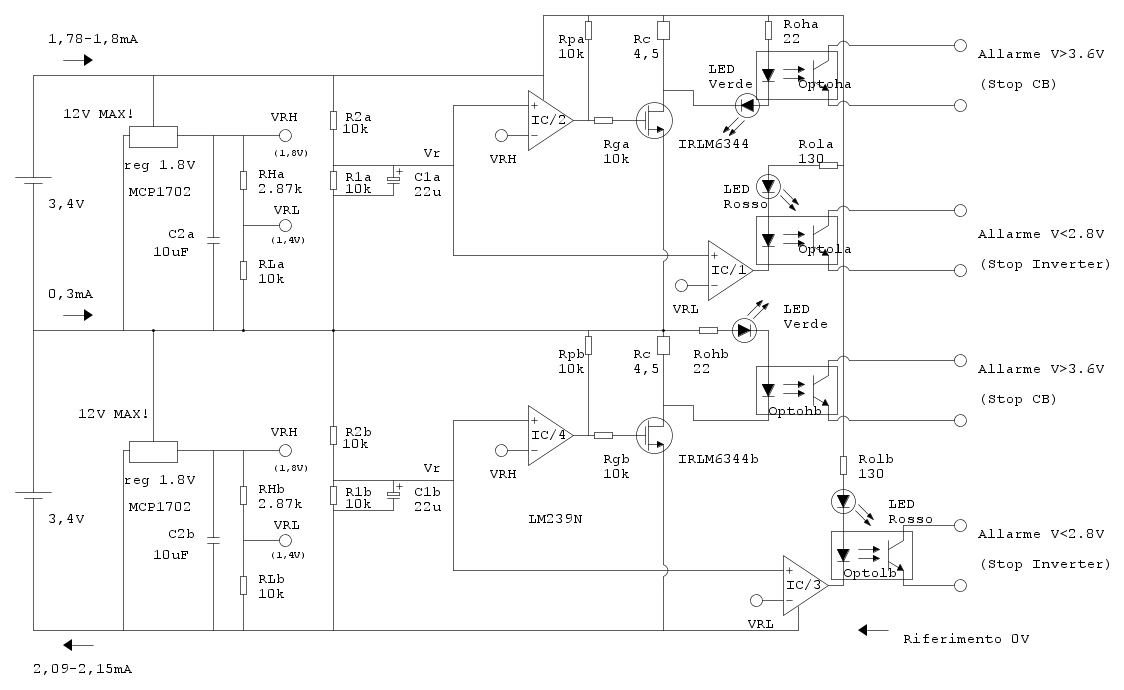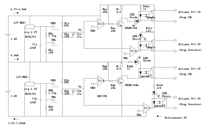 La cosa che non mi spiego e che dallo schema mi sarei aspettato un assorbimento maggiore dalla cella alta, a causa delle due pull-up Rpa e Rpb che drenano corrente verso il riferimento "0V".