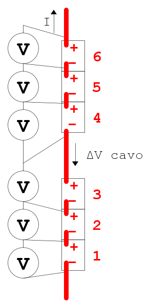 Spostando il punto di collegamento del cavetto del voltmetro la cella che include la tensione sul cavo diventa la n.3: