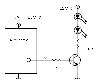 Si, fai bene a dare ad Arduino una tensione sui 9V, lavorerà felicemente. Ma non ho capito se questa alimentazione è la stessa che vuoi usare per i LED, in modo da usare un unico alimentatore.... che non sarebbe quel gran problema se non per quei 5 LED bianchi che dovresti dividere in 3 paralleli (2+2+1).