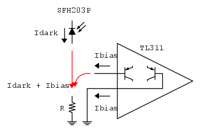 Visto che hai gia' misurato la corrente di buio del fotodiodo dovresti misurare la corrente di bias del comparatore utilizzando lo schema qui sotto (TL311 alimentato a + 5V e fotodiodo scollegato):