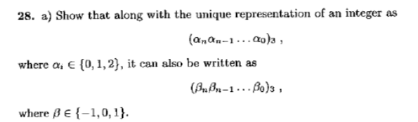 Se ho capito bene ti chiede di dimostrare che un numero intero in base 3, con cifre pari a 0, 1 o 2, sia uguale ad un numero intero in base 3 però con cifre pari a -1, 0, 1.